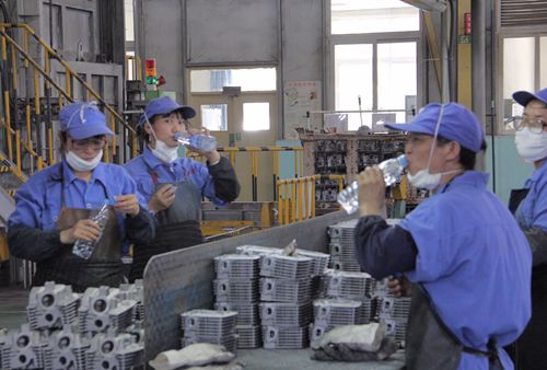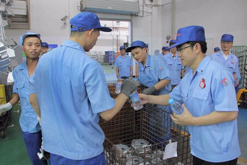 當(dāng)天公司總經(jīng)理大津義彥,副總經(jīng)理王家祥,黨委書記奚正興,執(zhí)行委員大西敦等走訪慰問了總裝課、鑄機(jī)課、保全課、KD部品課、涂焊二課、涂焊一課、倉(cāng)儲(chǔ)中心、檢查課等一線職場(chǎng)。每到一處,領(lǐng)導(dǎo)們首先了解各課防暑降溫工作情況,希望各課切實(shí)保障員工生產(chǎn)過程中的安全與健康,保證暑季生產(chǎn)安全。隨后,公司領(lǐng)導(dǎo)走到正在認(rèn)真工作的員工身邊,遞上飲品,感謝員工高溫下的辛勤工作,叮囑員工注意安全、注意休息。當(dāng)天,公司領(lǐng)導(dǎo)共送出礦泉水90箱,共計(jì)2160瓶。
